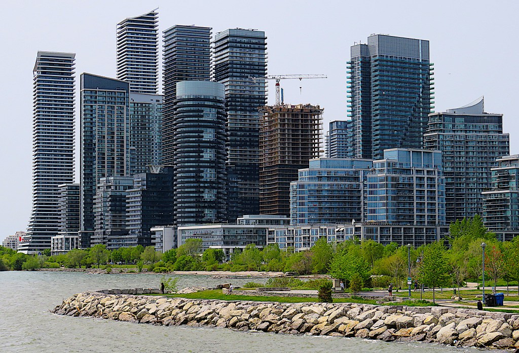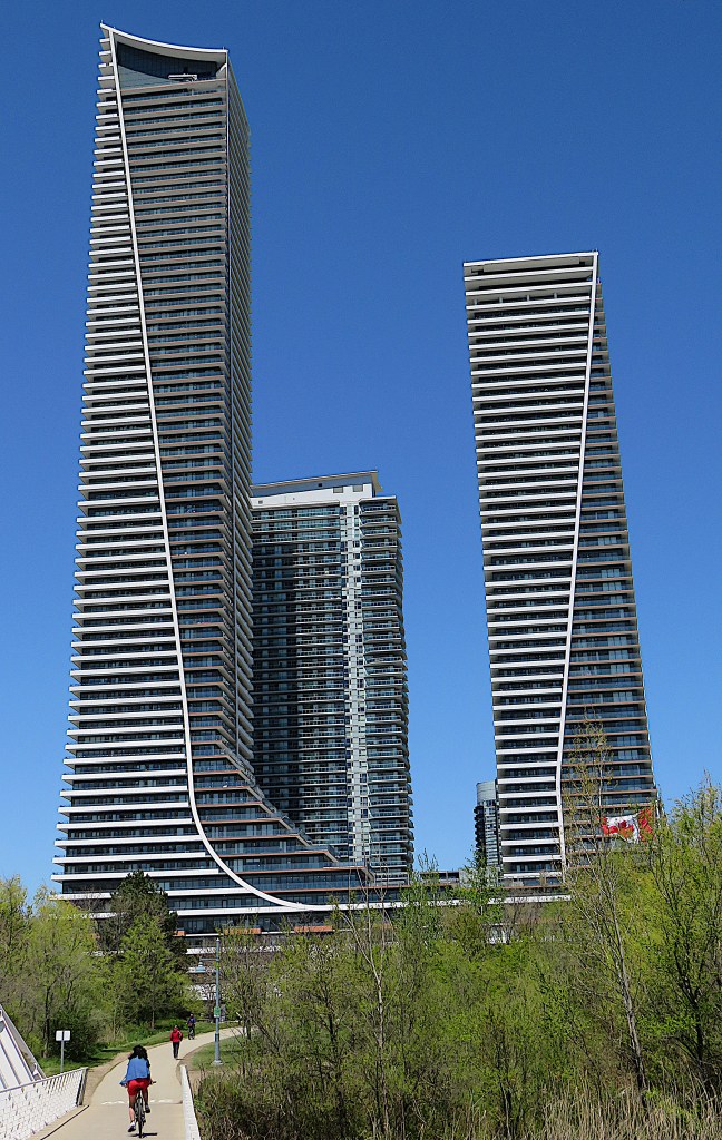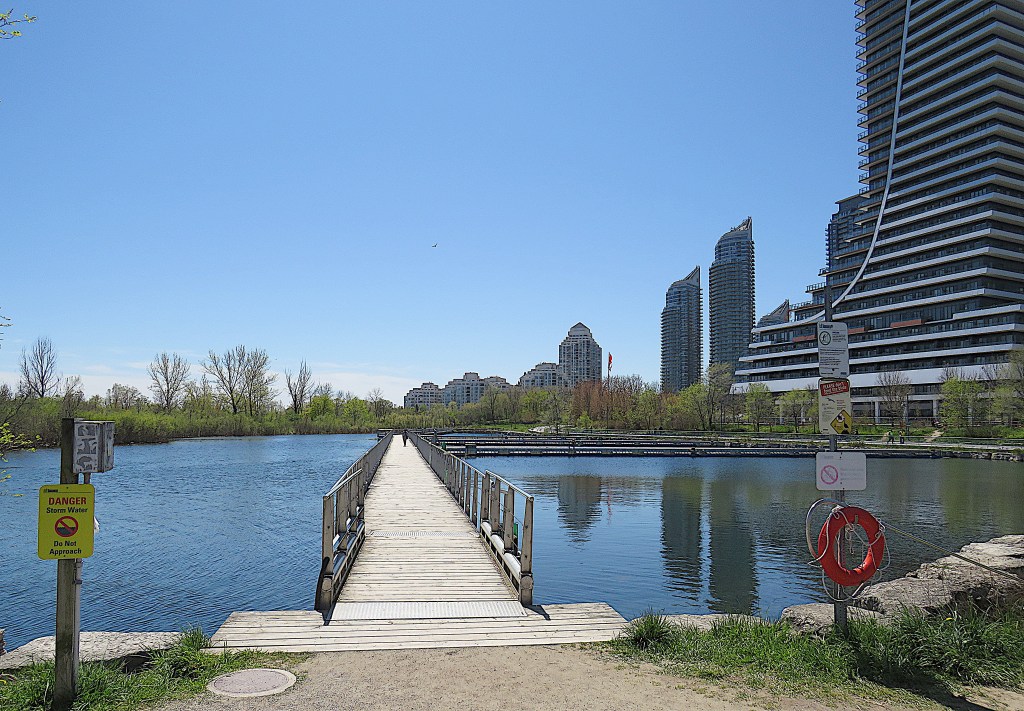 33. Even more than the previous hike, this one has two completely different facets. On the one hand, the shore of Lake Ontario is lined by giant condominium towers with pretentious names, and several more are under construction at any given time. Above is the scene that greets you as you cross the Mimico Creek Bridge heading east. At left is the Eau du Soleil Sky Tower (750 units, 66 storeys, 228 m, 2019), currently the 11th tallest tower in Toronto and the 14th tallest in Canada. It’s Toronto’s, and Canada’s, tallest skyscraper outside a central business district, at least for the moment. It’s connected at podium level to the Eau du Soleil Water Tower (330 units, 49 storeys, 179 m, 2019), merely the 38th tallest in Toronto. Between the two, with its slightly wavy profile, is Jade Waterfront Condos, which at 138 m doesn’t even make it to the list of the more than 80 skyscrapers in Toronto over 150 m in height …