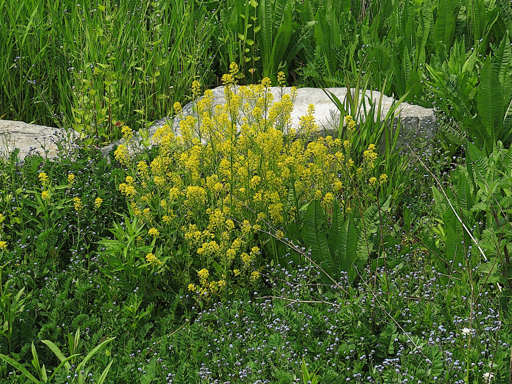 54. The yellow flowers of bitter wintercress (Barbarea vulgaris) are in evidence everywhere in the Wildflower Meadow in May, here framed by forget-me-nots.
