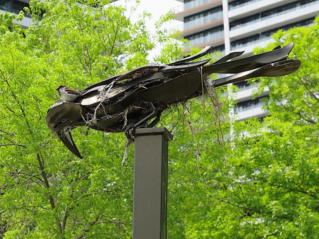 52. A real sparrow sits on one of the welded steel ravens perched on metal poles in the Home Garden. The raven, whose hollow interior can be used as a nesting place, is part of an installation called “Guardians” by Amy Switzer (Canadian, b. 1971).