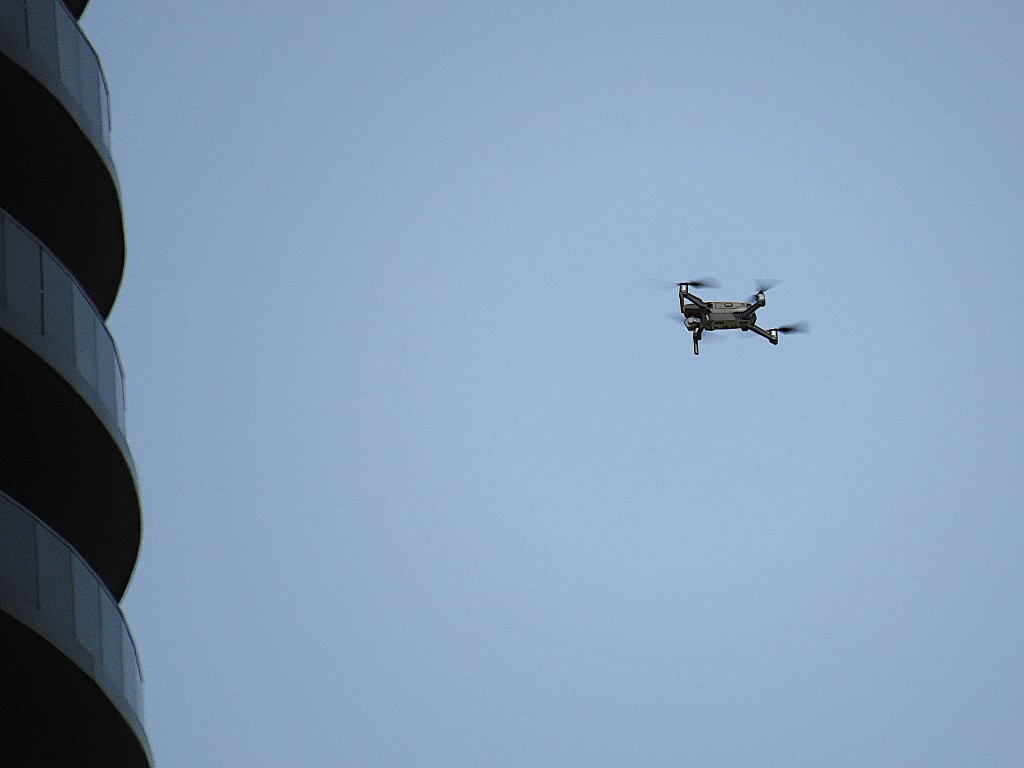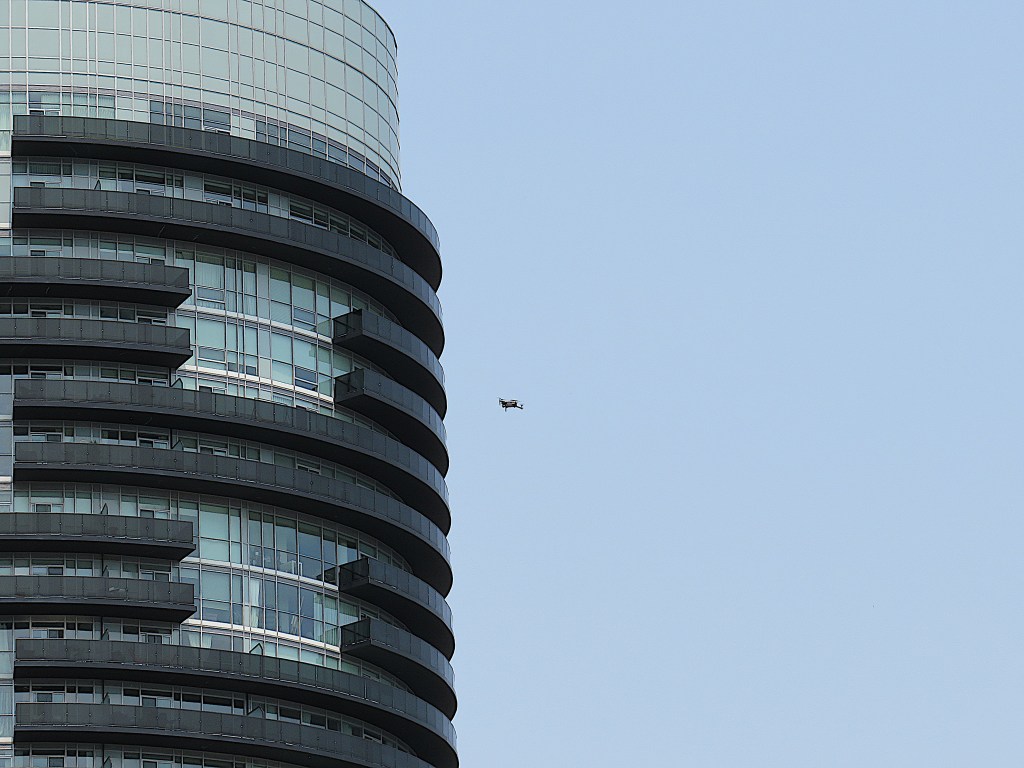 46. … but actually it’s a drone. Is it taking a video of this highrise cluster, or is it voyeuristically peeking into the interior of one of the apartments? Here are some of regulations governing drone-flying in Canada. Maintain line-of-sight at all times. Don’t fly higher than 122 metres above the ground. Don’t fly closer than 30 metres from people and animals for basic operations. Keep a safe distance from buildings and vehicles. Don’t fly closer than 5.6 km from an airport, 1.9 km from a heliport. To these, I’ll add: Don’t expect privacy these days if you live in an eye-catching glass-walled cylinder thirty stories high.