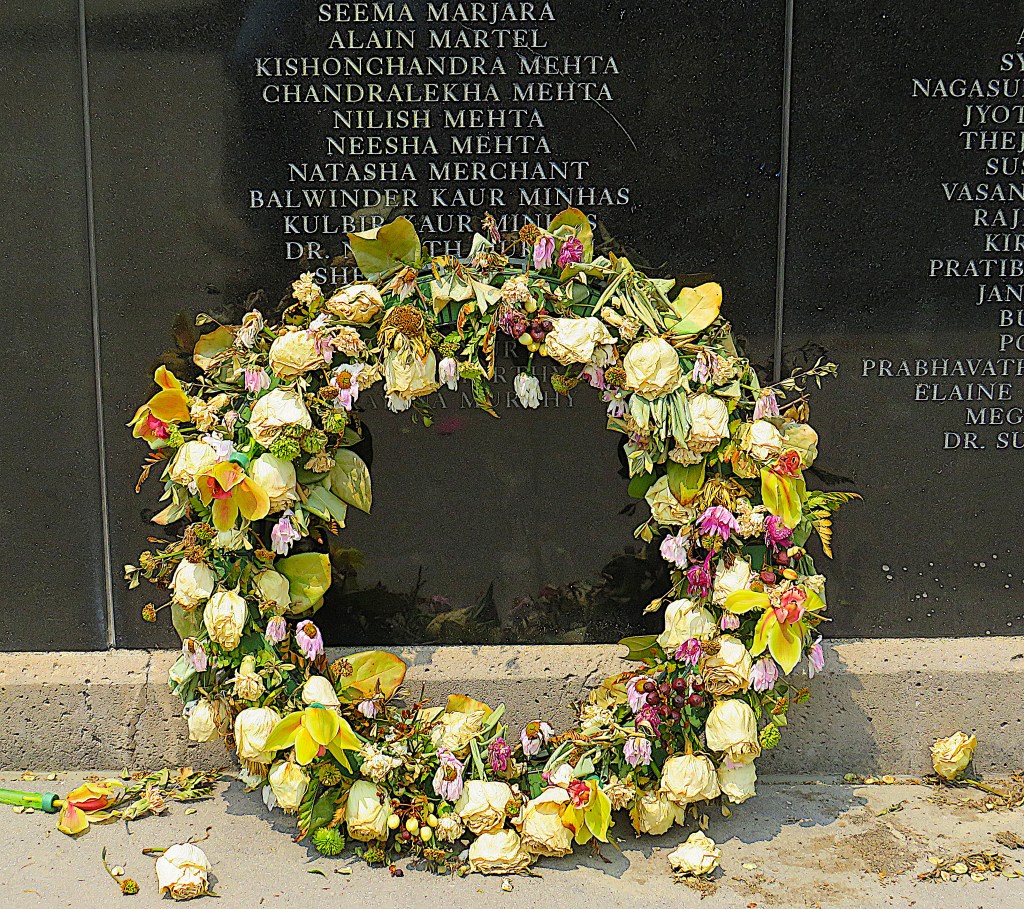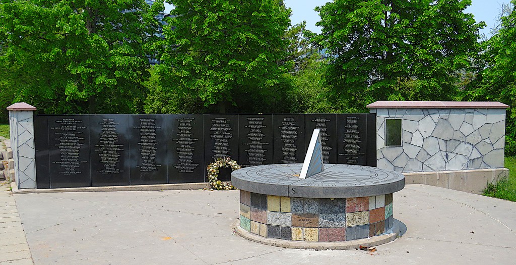 The black wall contains the names of the dead, 268 of them Canadian citizens, mainly from the Toronto and Montreal areas. The wall also commemorates the two Japanese baggage handlers killed on the same day when another timebomb, in baggage due to be transferred from a Canadian Pacific plane to an Air India one, exploded prematurely at Narita airport in Tokyo.