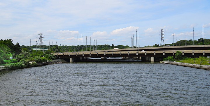 60. The view upstream from the Bridge is not very attractive, as it is largely blocked by low road bridges carrying Lake Shore Boulevard West, the Gardiner Expressway, and the Queensway over the River. This is a pity, as on the bank at left is the start of a historic and appealing walk north up the Humber Valley, that is, along the opening stretch of the Toronto Carrying-Place Trail (see #65 below). But to get to it you have to negotiate the dank gloom under all those ugly bridges.