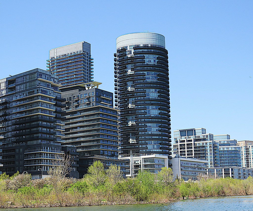 44. The view of the lakeshore from Humber Bay Park East suggests that the parkland dividing the condos from the Lake is pretty thin. That cylindrical tower is Waterscapes at 80 Marine Parade Drive …
