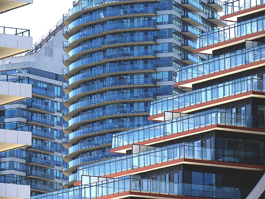 48. … but the view away from the lakeshore is dense and urban. There are more than fifty high- and mid-rise condos on the Humber Bay lakeshore, and every apartment has its own balcony. These balconies are supposed to provide “stunning” views while helping those living in confined quarters in these dense developments avoid claustrophobia. But the winds at elevated altitudes, vertiginous drops, and external noise can make it too uncomfortable for condo dwellers to sit out on their balconies, even in summer. So balconies are frequently used just for storage of large items like bikes and barbecues. Such heavy metal objects may accidentally collide with balcony glass. There have been many “falling glass incidents” in Toronto when parts of balconies in older towers have abruptly descended on the street below. Developers are now encouraged to use more expensive laminated glass (of the kind used for car windshields) on balconies, at it’s supposed to retain its structure better if damaged.
