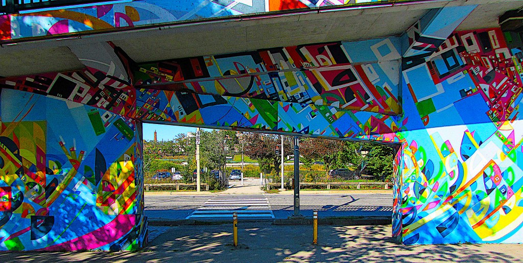83. This is the trailside access near the Palais Royal to the bridge that takes pedestrians and cyclists more than 200 metres over Lake Shore Boulevard West, the Gardiner Expressway, and the GO Train tracks to the intersection of Queen St. West, King St. West, and Roncesvalles Ave. The Roncesvalles Pedestrian Bridge, as it’s called, was decorated (top) with colourful street art (2017) by Justus Roe as part of a cultural exchange between Toronto and Chicago. But Roe’s designs have now been partly overwritten and thoroughly disrespected by taggers (bottom).