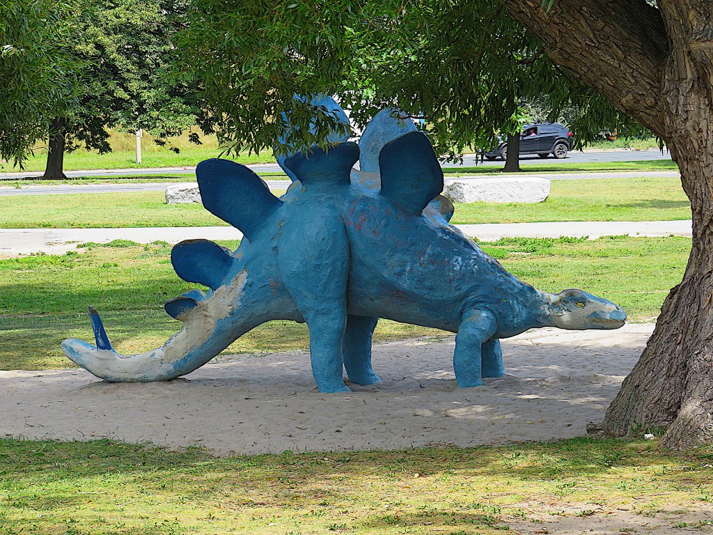 80. The next green space to the east is Budapest Park. This patched-up blue stegosaurus stands forlornly next to a paddling pool east of Sunnyside Gus Ryder Pool. It just couldn’t take the strain of having kids clambering all over it.