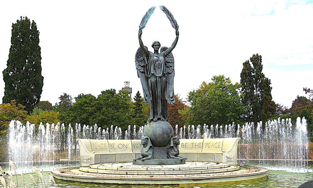 95. The Shrine Peace Memorial in the rose garden in Exhibition Place. It was presented to the people of Canada in 1930 by the Ancient Arabic Order Nobles of the Mystic Shrine. That’s the official name of the Shriners, the US-based Masonic brotherhood founded in 1870 whose costume and ritual draws on Middle Eastern themes. This has sometimes led the Shriners to be wrongly identified as a Muslim organization, whereas in fact their creation was fuelled by orientalism, that often patronizing western tendency to essentialize and imitate eastern culture and manners. Toronto hosted the Shriners’ annual Imperial Sessions as early as 1888 and as recently as 2010. The bronze statue “Angel of Peace” by Shriner sculptor Charles Keck (US, 1875-1951) is of an angel holding olive branches and supported by sphinxes. The legend around the base of the statue is PEACE BE ON YOU. ON YOU BE THE PEACE. The installation celebrates the long state of peace between the US and Canada. The fountain was added in 1958.
