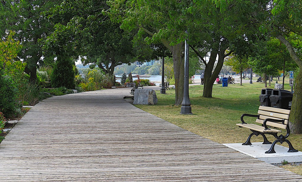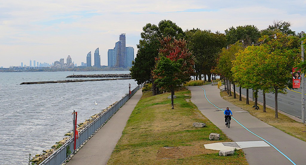 67. The official name of the main trail from this point on the lakeshore eastward is the Martin Goodman Trail. The MGT runs 22 km from the Humber Arch Bridge to Balmy Beach, the latter of which will eventually be my terminus. Signs like the above – very infrequently provided – indicate that the MGT is suitable for jogging, wheelchairs, hiking and cycling. And it’s true that much of this section of the MGT is well paved, broad enough for two-directional use, and segregated from motor vehicles. You can even travel it on Google Street View. But it isn’t true that the MGT is suitable for jogging or hiking. Its chief hazard for people on foot – and it really is a hazard – are cyclists who feel that the MGT west of downtown is designed solely for them and pedestrians should stay out of their way or pay the price. These cyclists will approach you from behind without warning at great speed. Resistance is futile. The sheer number of them at most times of the day makes it dangerous to defy them. It’s much safer and pleasanter to take one of the parallel trails, like the Sunnyside Boardwalk, that are reserved solely for pedestrians.