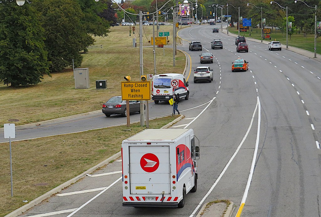 86. … and as an example of how difficult it is even for adult pedestrians to negotiate a passage between city and lakeshore, observe this young woman (centre) with the yellow bag risking her life to cross five eastbound lanes of Lake Shore Blvd.