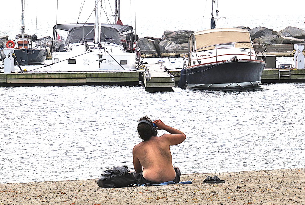 79. … but this gentleman wearing headphones, catching a few rays, and sinking a cold one on this beach east of the Boulevard Club seems to be enjoying his solitude.
