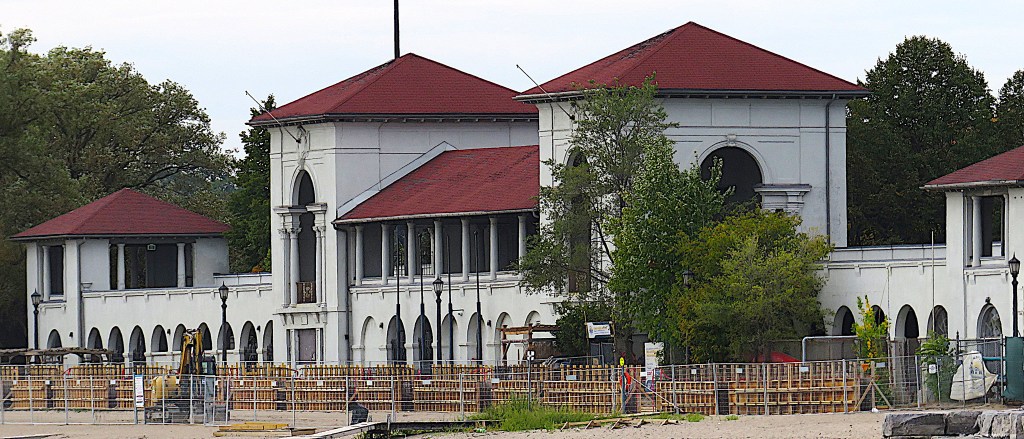 82. The Sunnyside Boardwalk, whose western end is near the Humber Arch Bridge and whose eastern end is here near the Palais Royale (a ballroom and wedding venue), is much pleasanter to walk along than the parallel MGT and its speeding cyclists. The original wooden boardwalk depicted in #73 above was replaced in the 1990s by one made of plastic planks, and is reserved for pedestrians only.